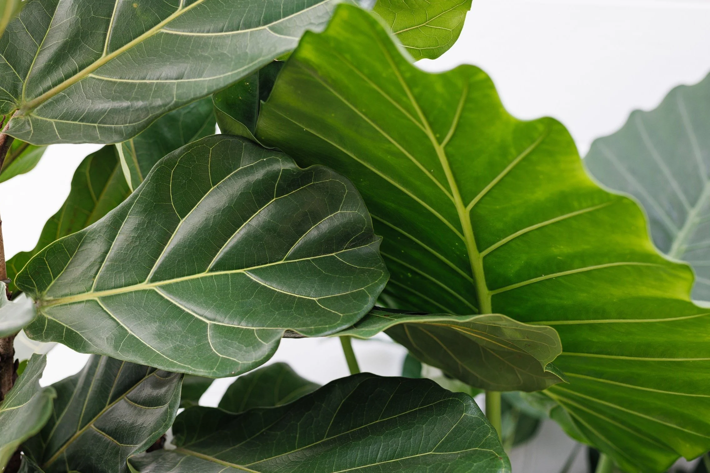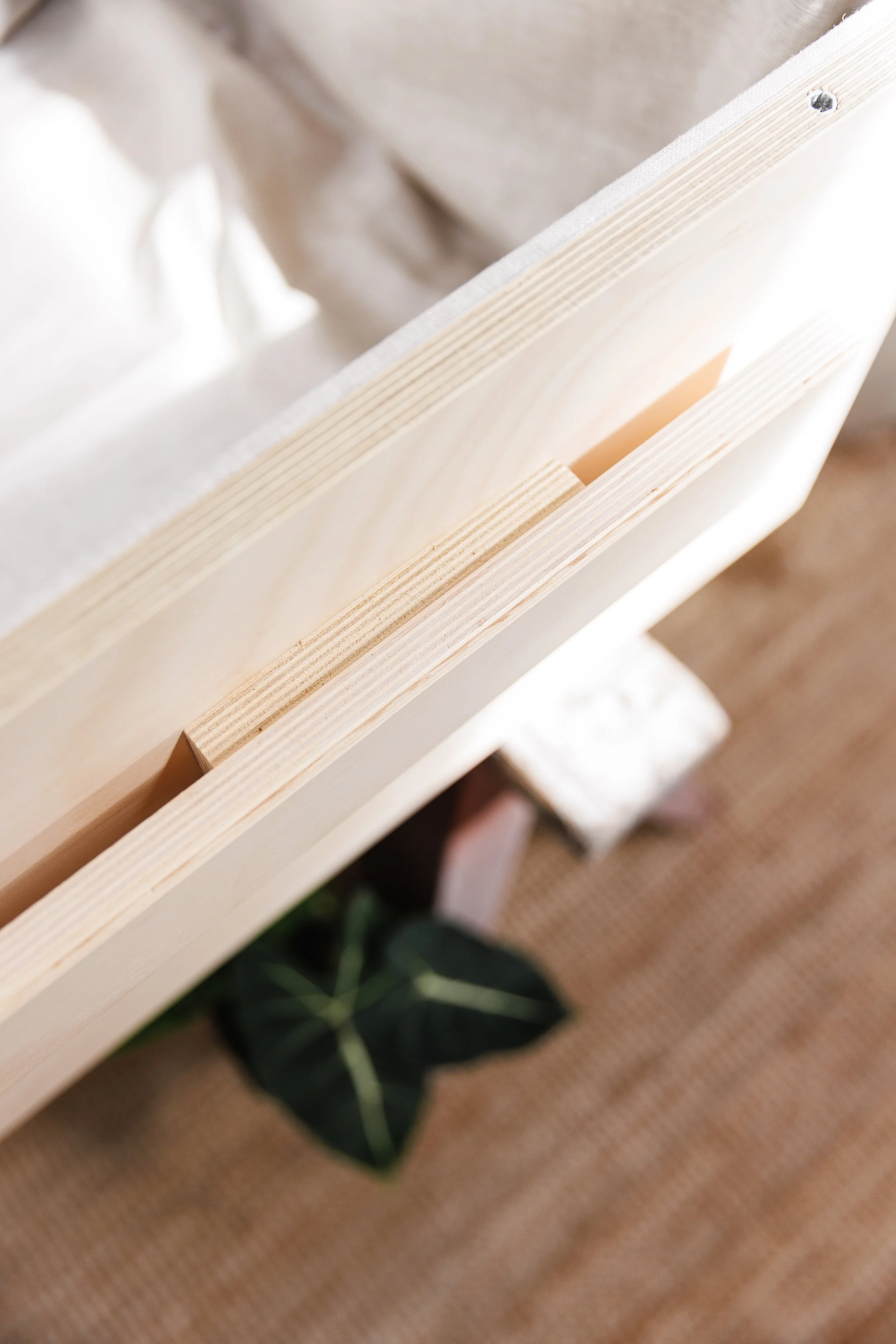 Close-up of a light wood timber casket, handle and internal lining, showing clean lines and smooth texture. A green plant with large leaves is partially visible below, set against a woven light brown carpet.
